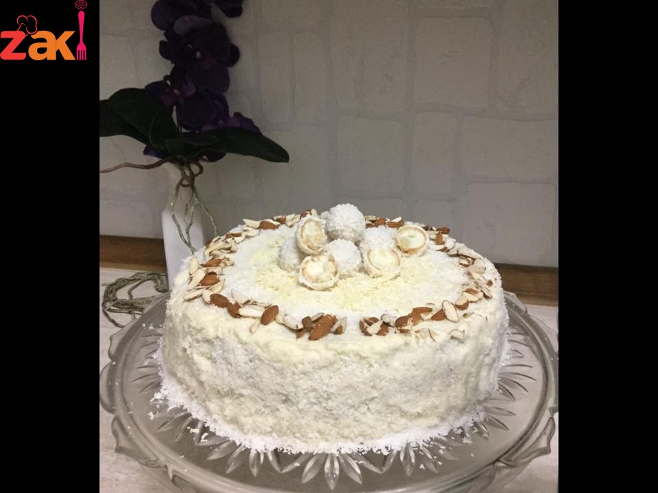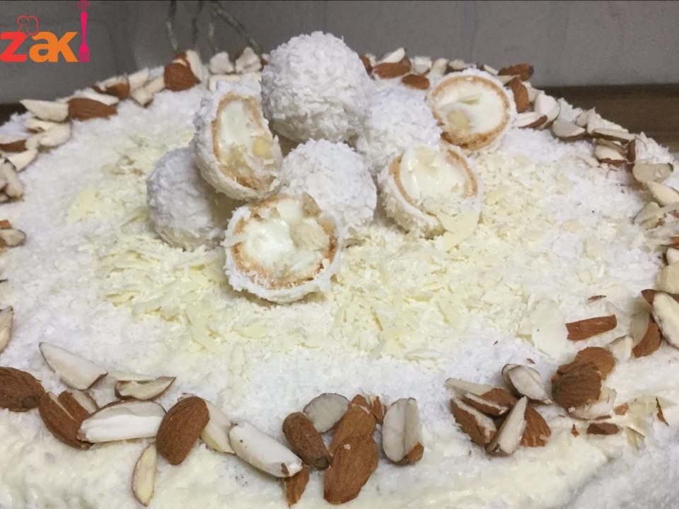 وهكذا الطبقة الثانية والثالثة ويغلف القالب كل بجوز الهند المبروش ويزين السطح بلطبات وانصاف الرافيلو ولفائف مو الشوكولا البيضاء