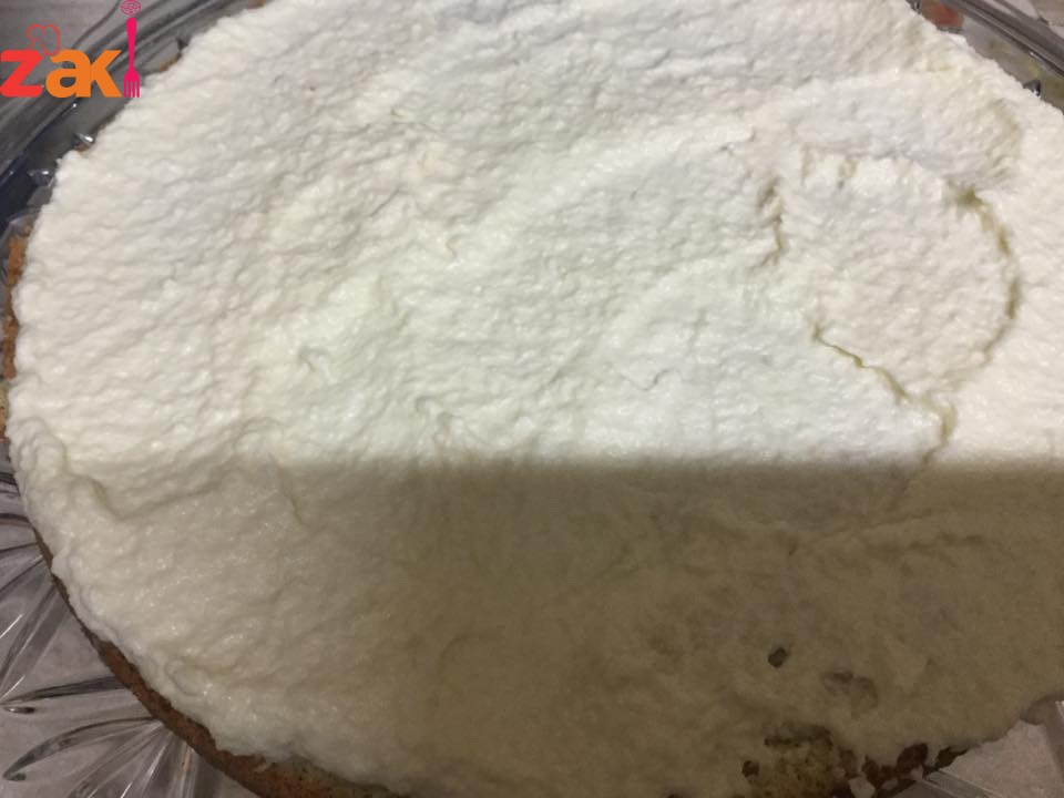 ثم ندهن الكيك كل شرحة 1/3 كوب من حليب = 80 غرام جوز الهند وتمد فوقها 1/3 الكريمة مع دهن الجوانب لكل طبقة