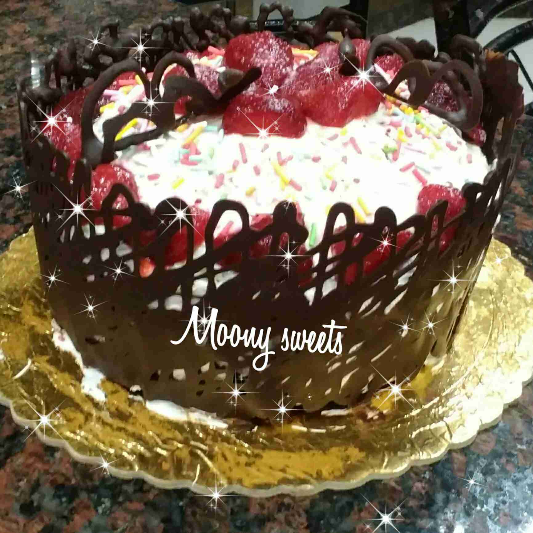 بعدين حطيتها بكيس حلواني وحبت ورق الزبدة ( بده يكون مقصوص ع قياس الكيكة ) بعدين عملت بالشوكولا عالورق خطوط عشوائية وتركتها وقبل ماتجمد الشوكولا عالاخر حطيتها حولين الكيكة وحطيت الكيكة بالتلاجة وبعد نص ساعة شلت ورق الزبدة وبعدين زينت الكيكة بالفراولة