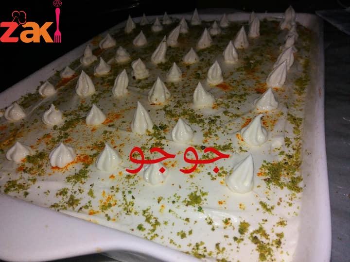 وبعد بردت خلطتا نص الحليب المكثف مع علبة حليب الشاي وسقيتها بالخليط وهو حار وبعد بردت تماما ضربتا الكريمة وزينتها بيها ورشيت شوية زعفران وفستق حلبي ويصب الصوص بعدالتقطيع في صحن التقديم وبالهناء