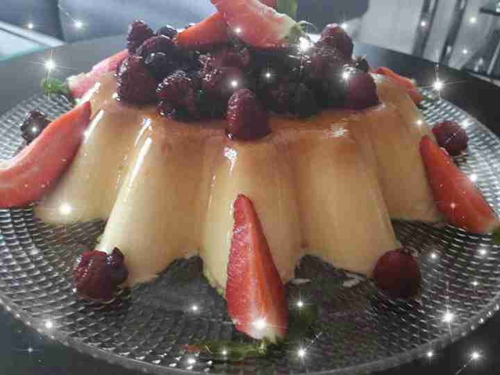 - On commence par préparer notre caramel on mets le sucre sur feu doux sans mélanger puis on le verse dans le fond d’un moule On mélange tout les ingrédients pour obtenir un mélange homogène on les mets dans une casserole à feu moyen jusqu’à ébullition puis on verse dans le moule et on laisse au frais minimum 2h.