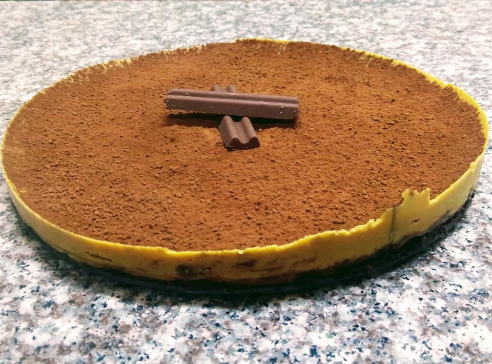 وتأكدو خلاطكم قزاز عشان الكراميل حار ،نصب الخليط فوق الكيك ونرش فوقها كاكاو ولاتحركو الصينيه لمدة
