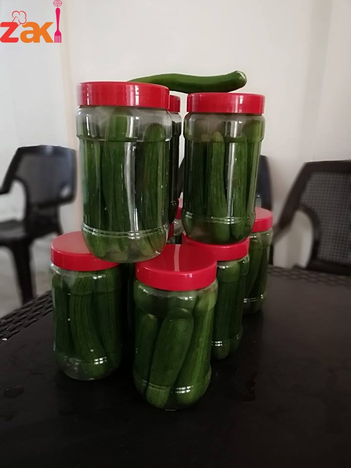 غسل الخيار وإزالة الزهزه من الأعلى والاسفل. فتح الخيار من الجوانب. غلي الميه والملح لدرجه الغليان ع نار. ثم تبرده. ثم رص الخيار في المرطبان بحيث عندما تقلبي المرطبان لا تسقط حبات الخيار والفلفل الحار.. بيكون محلول الميه الملح بارده بنضيف ليه الخل الأبيض ثم وضعه فوق الخيار بتكون الميه غامرته يعني يصل إلى باب المرطبان ثم إغلاقه بأحكام.. ثم وضعه في شمس اربع ساعات. ثم حفظه لحين الاكل ياخد معكم من أربع إلى خمس ايام استواء. ممكن زياده كميه الملح حتى الحفظ طويل الأمد..